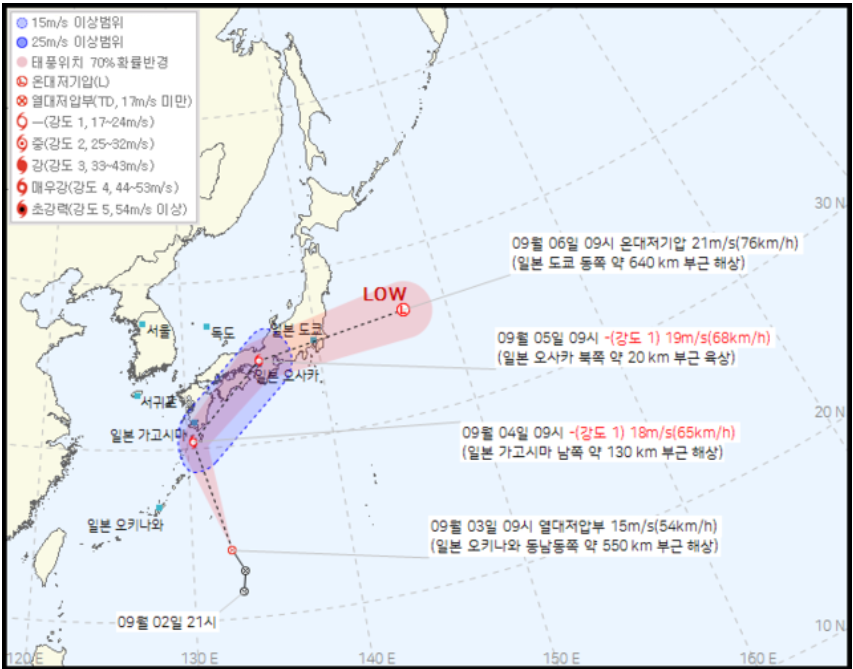 현재까지는 일본 관통 가능성이 가장 높지만, 북태평양 고기압이 수축하거나 기압골이 변화할 경우 동해 진입 가능성도 배제할 수 없습니다.