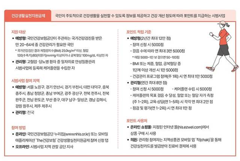 보상 형태: 일정 포인트 이상 적립 시 건강검진, 건강물품 교환, 지역 화폐 전환 등 가능