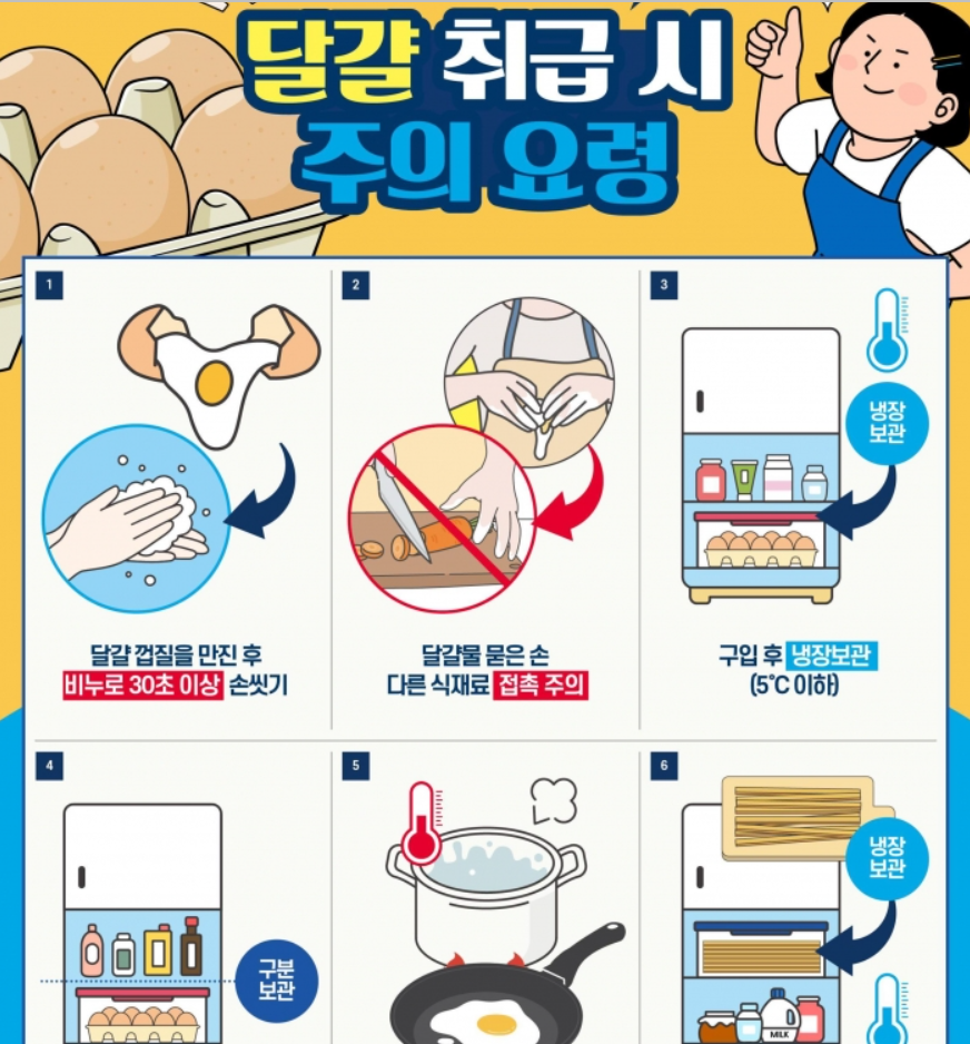 조리 용기, 칼, 도마 등은 달걀 사용 후 즉시 세척·소독하여 다른 식재료와 격리 보관이 중요합니다 .