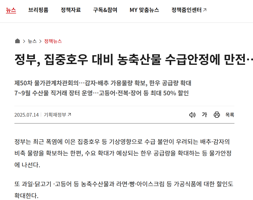 장마·호우 시기에 가격이 급등하는 과일·육류에 대한 정부 대응의 연장선입니다.