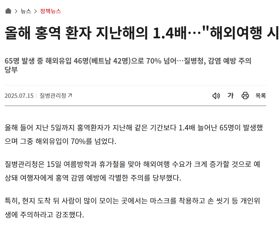 2025년 상반기 기준, 국내 홍역 환자 수는 지난해 같은 기간보다 1.4배 증가했습니다.